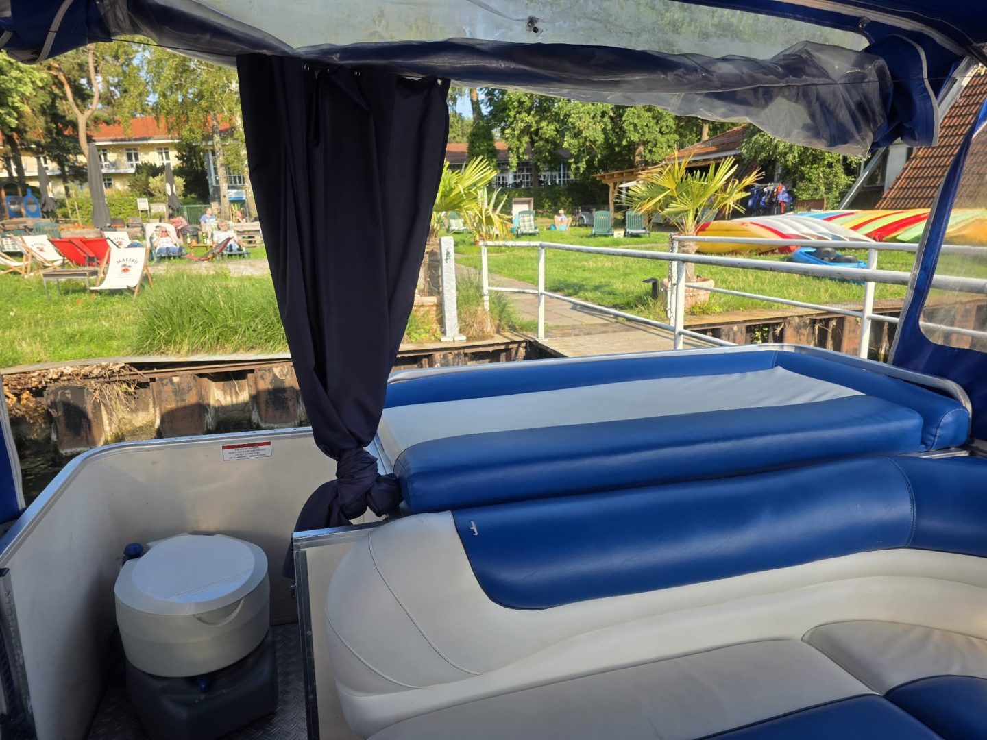 An Bord befindet sich alles, was einen gelungenen Ausflug auf dem Wasser ausmacht. Eine gemütliche überdachte Fläche bietet Schutz bei Sonne oder leichtem Regen. Zusätzlich stehen eine Toilette sowie ausreichend Sitz und Liegemöglichkeiten zur Verfügung. Die begehbare Dachplattform lädt dazu ein, den freien Blick über die Wasserlandschaft zu genießen und entspannte Momente an der frischen Luft zu verbringen.